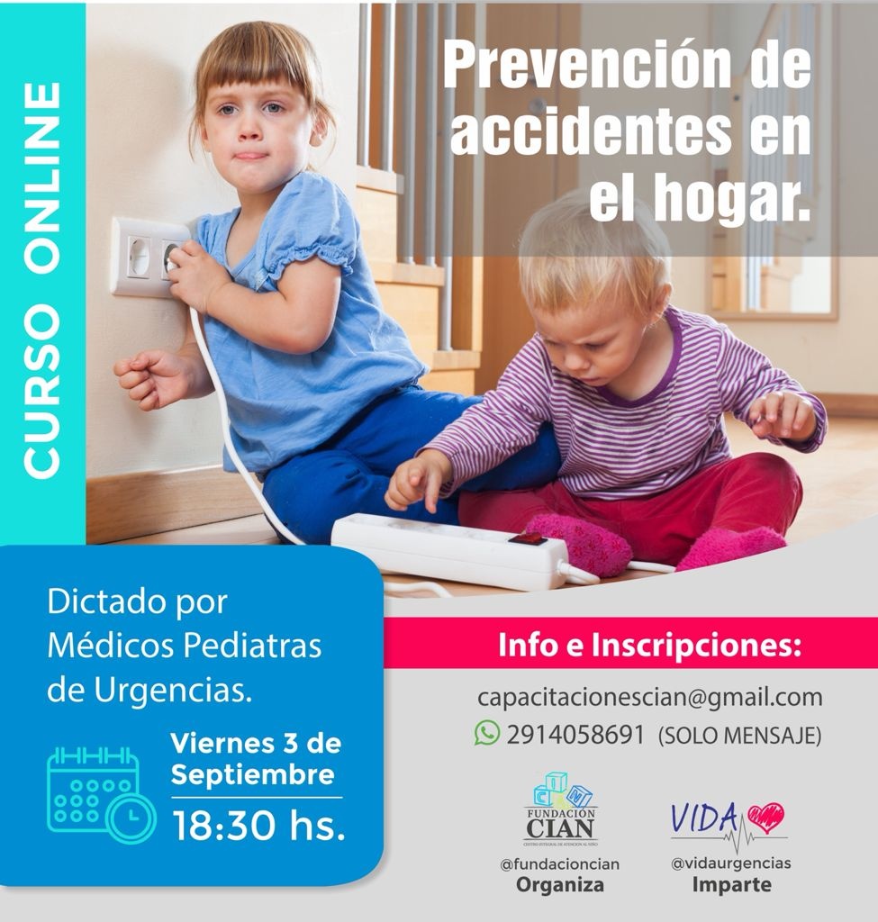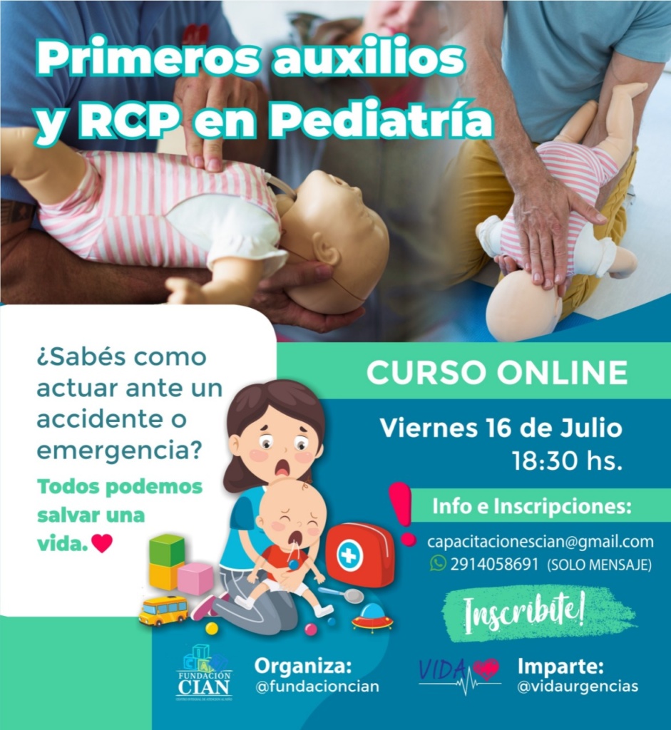 Fundación CIAN, con la colaboración de Vida Urgencias, invitan a una nueva capacitación online, esta vez la temática será Primeros Auxilios y RCP en Pediatría. Para ampliar la información e inscripciones, escribir a capacitacionescian@gmail.com o mensajes al 2914058691 ¡Los esperamos!