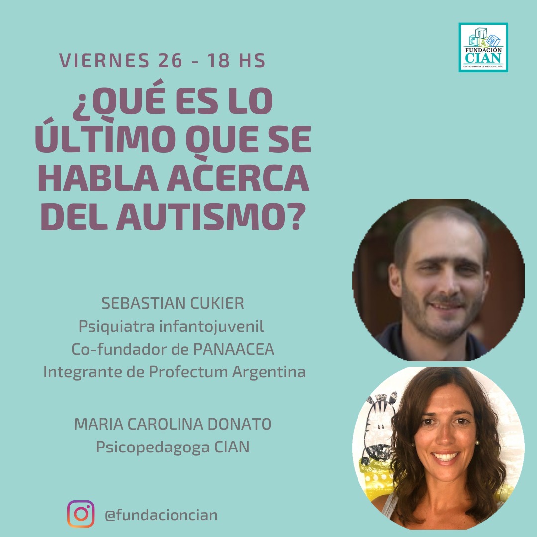 Hoy los esperamos en un nuevo vivo de Instagram, en el cual participarán Sebastian Cukier, Psiquiatra infanto-juvenil co-fundador de Panaacea e integrante de Profectum Argentina, y María Carolina Donato, Psicopedagoga de CIAN. Conversarán sobre las últimas novedades en materia de autismo.